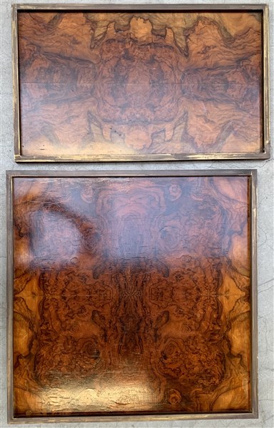Lotto composto da due vassoi in radica di noce con ringhiere in ottone. Italia, secolo XX. (cm 76x76; cm 47x78) (difetti)