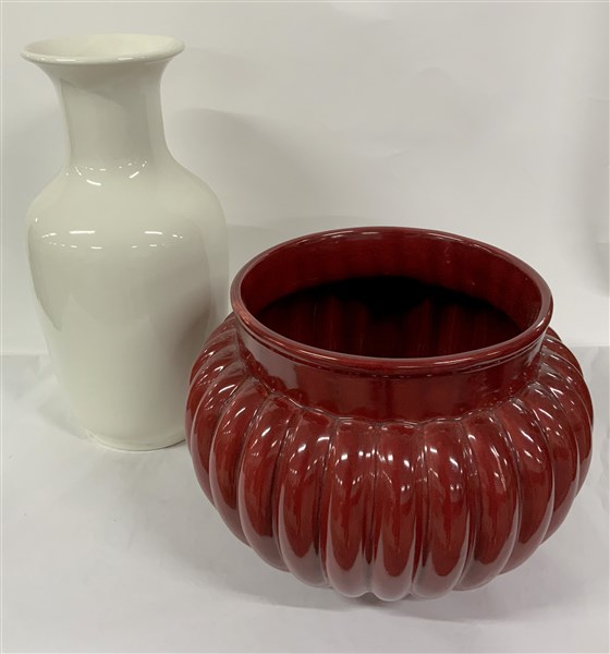 Lotto composto da un vaso in ceramica smaltata bianca sotto vetrina unito a un vaso in ceramica smaltata rossa con corpo costolato firmato sotto la base. Italia, secolo XX. (vaso bianco cm h 42; vaso rosso cm h 25, d cm 36) (lievi difetti)