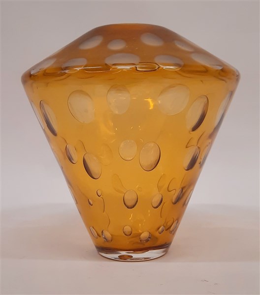 Vaso della serie "Millebolle". Probabile produzione Salviati. Murano, 1999. Vetro trasparente pagliesco e parzialmente acidato. In scatola originale. (h cm 28; d cm 26)