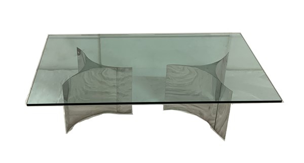 Tavolino da salotto con basi in acciaio cromato e piano in cristallo. Italia, anni '80/'90. (cm 142x38) (lievi difetti)