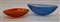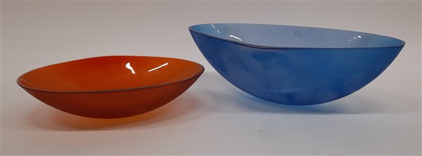 Lotto di due centrotavola della serie "Frammenti". Murano, 2005. Vetro acidato blu e arancione. In scatola originale. (h cm 7 e d cm 30; h cm 18 e d cm 44)
