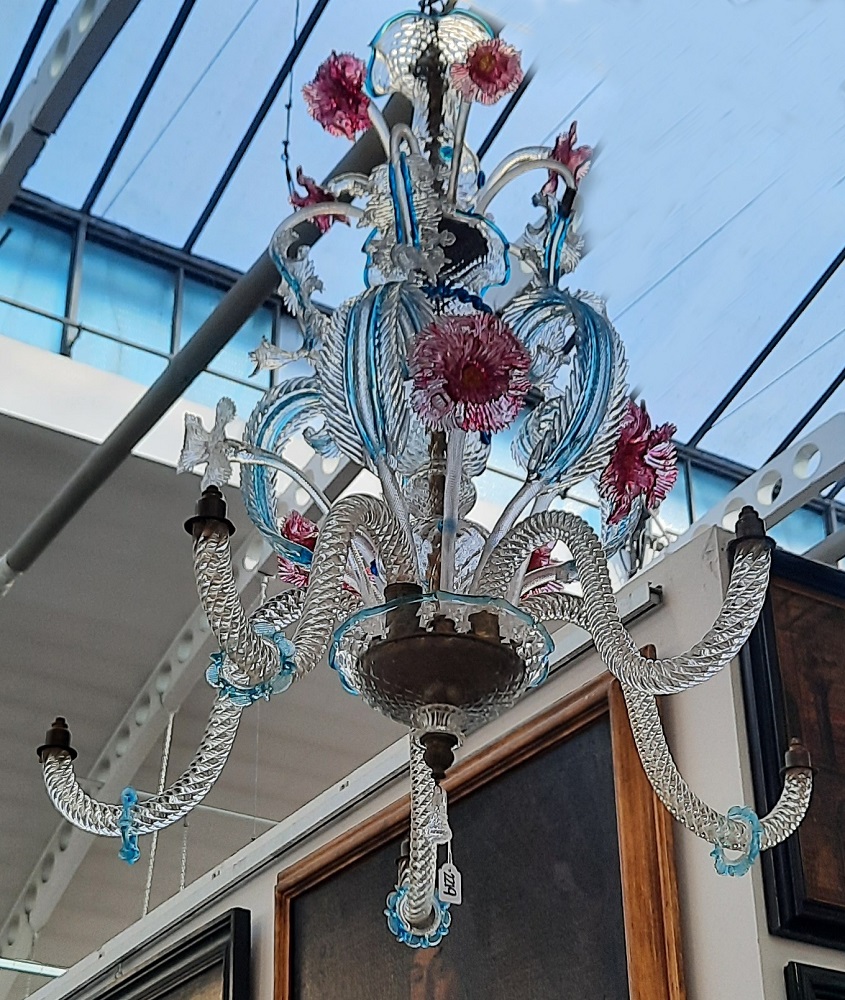 Lampada a sospensione in vetro soffiato a cinque luci con foglie e fiori. Anni '50. (gravi difetti e mancanze)