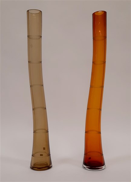 Lotto di due vasi cilindrici della serie "Phuket". Murano, 2005. Vetro trasparente ambra e grigio con fasce orizzontali acidate. Un esemplare frmato e datato all'acido sotto la base. In scatole originali. (h cm 60; d cm 9)