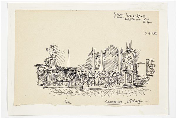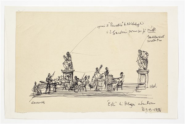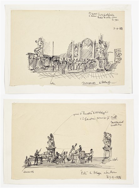Due disegni raffiguranti rispettivamente l'esecuzione dei "6 Nonsense" per coro a cappella e degli gli "Estri per quindici esecutori" di Goffredo Petrassi. Italia, 25090. Biro nera su carta. Annotati, locati e datati. Incollati su supporto di carta. (cm 16x23,7) (lievi difetti)