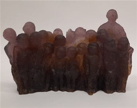 Scultura in pasta vitrea a cera persa color ametista e ambra. Esecuzione DAUM, Francia, 1984. Edizione limitata 96/100. Firmata al retro "DAUM FRANCE". (cm 34,5x23)