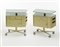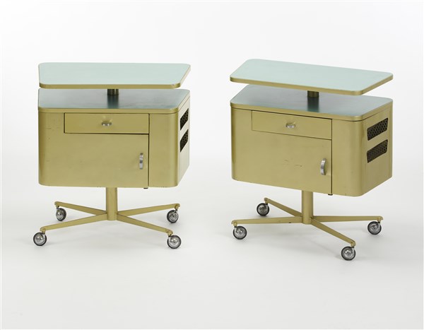 * Lotto di due comodini su ruote ad un cassetto, un'anta, due ripiani a giorno e una tasca porta riviste su un lato. Produzione Officine Valsecchi, Milano, 1957. Acciaio stampato e verniciato color verde metallizzato, piani rivestiti in formica verdina, bordure in alluminio ottonato. (cm 66x74,5x35,5) (lievi difetti)