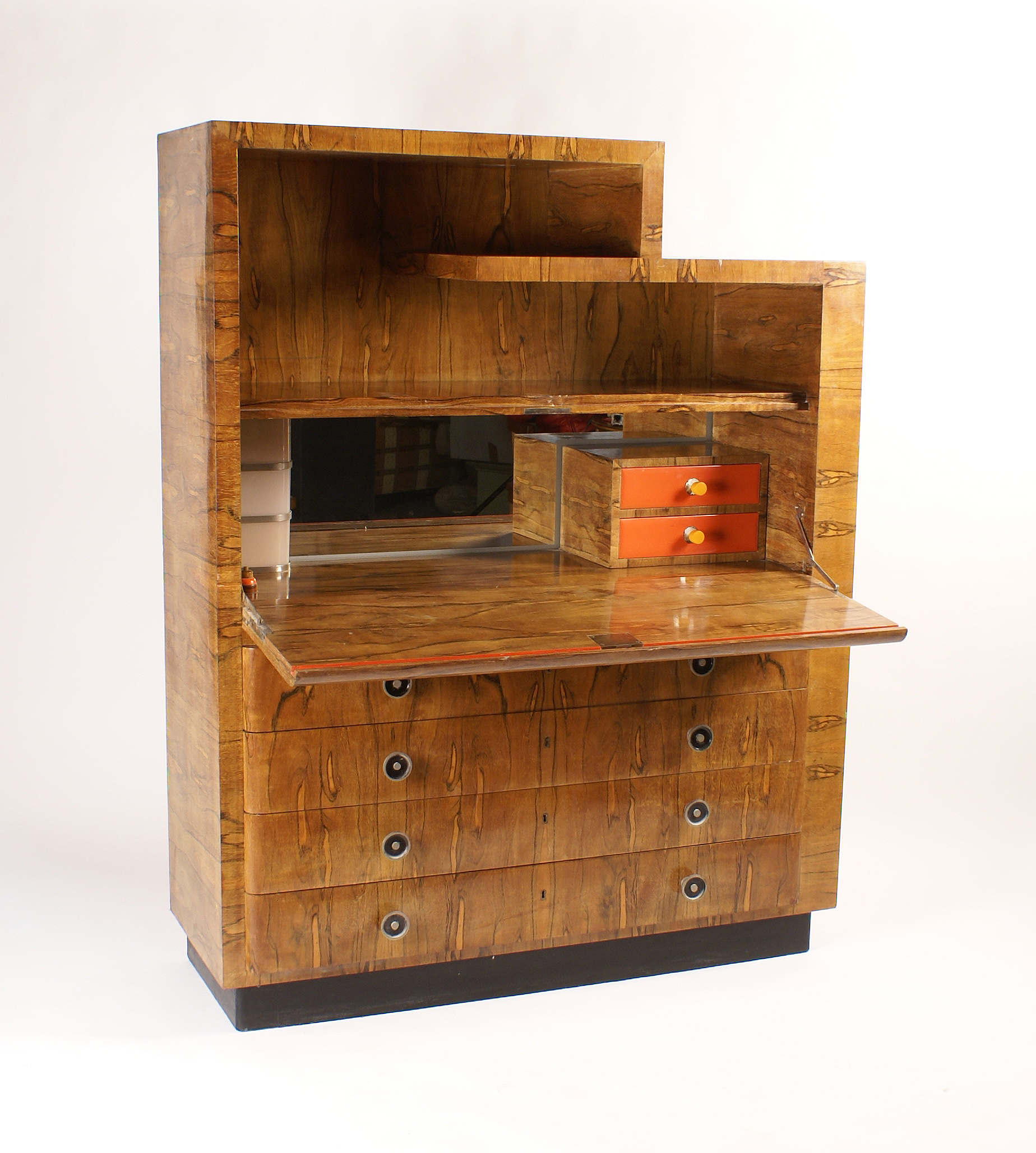 PARTICOLARE MOBILE Decò in palissandro, fronte con scomparti a vista e calatoia celante tiretti e una lampada, quattro cassetti sottostanti 153x121x45 cm.