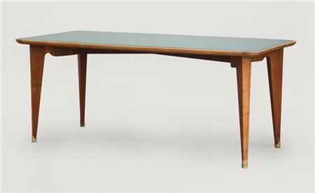 Tavolo da pranzo in legno di noce con piano retroverniciato azzurro. Italia, anni '70. (cm 189,5x79x90,5) (lievi difetti)