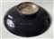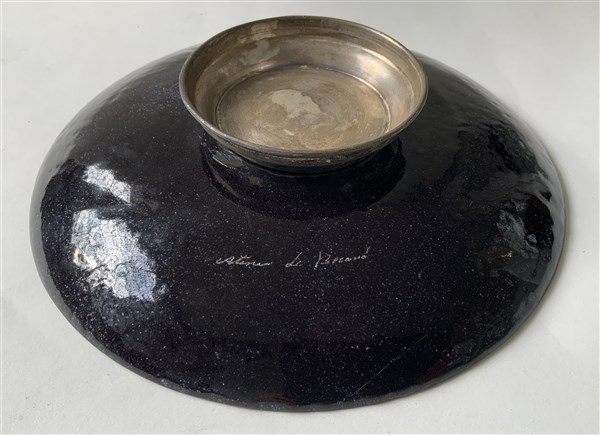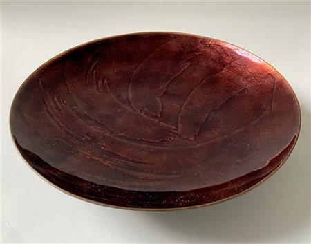 Alzatina con base in metallo argentato e piatto in rame smaltato nei toni del nero e vinaccia con motivi informali a rilievo sotto lo smalto. Italia, anni '50. Firma indecifrata al verso. (h cm 4,5; d cm 21) (lievi difetti)