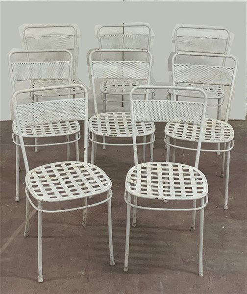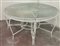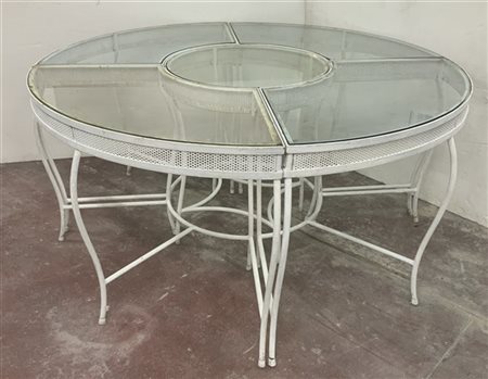 Fornitura da giardino in ferro battuto verniciato bianco composta da un tavolo tondo con piano in cristallo unito a otto sedie di analoga fattura. Italia, anni '50/'60. (tavolo cm h 72, d cm 150; sedie cm 39,5x78x55) (difetti)