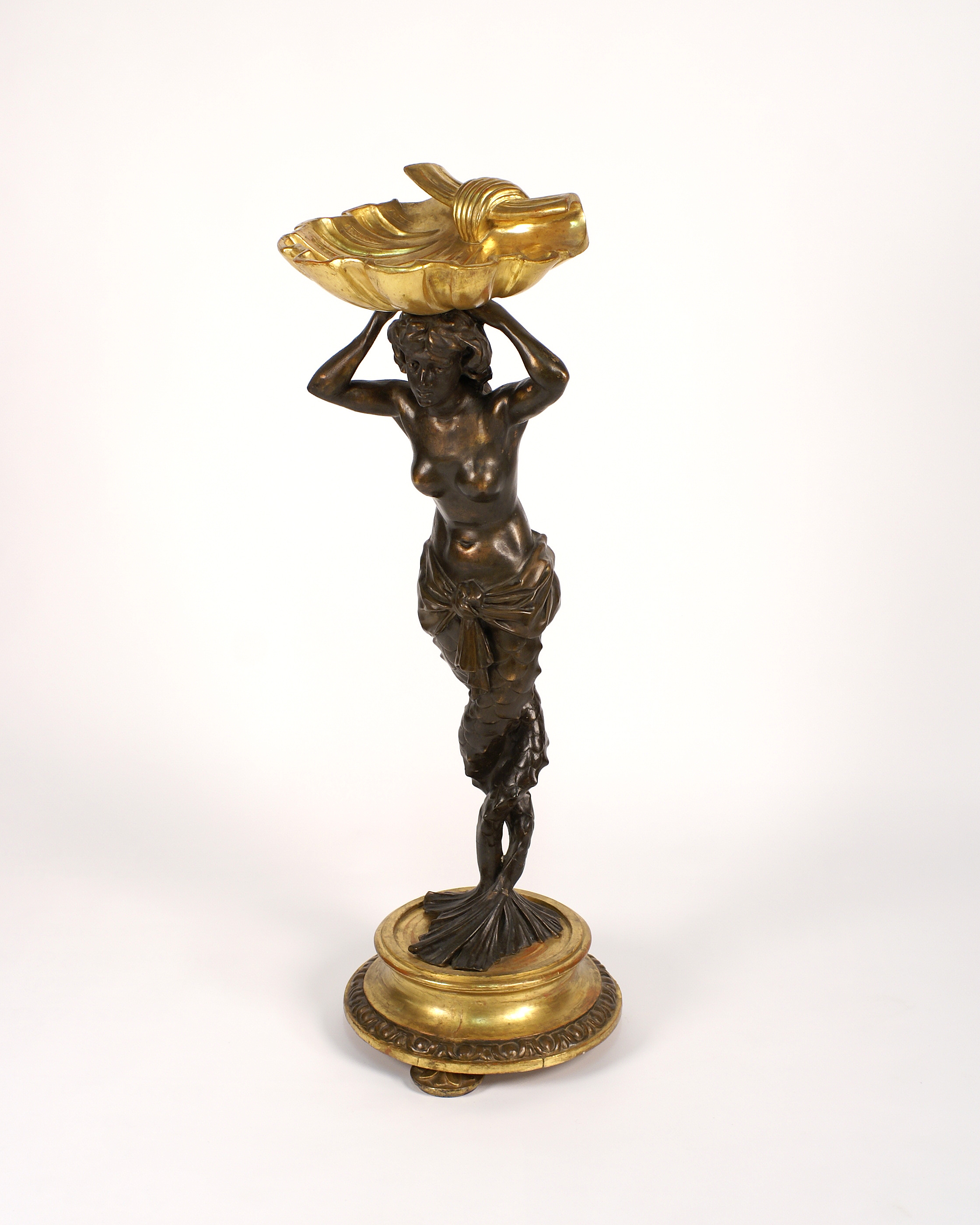 PARTICOLARE GUERIDON Francia XIX Sec. in legno dorato e laccato, intagliato a motivo di sirena nell'atto di sorreggere una conchiglia, poggiante su base in legno dorato h. cm. 105