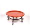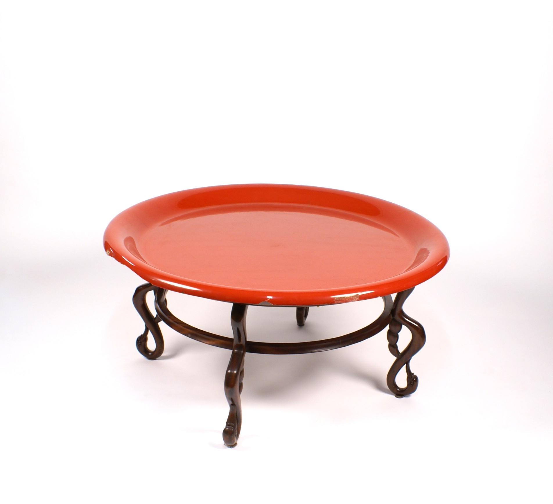 PARTICOLARE TAVOLINO BASSO manifattura recente piano circolare in faesite laccata rosso e poggiante su base intagliata a motivi di teste di cigno (difetti) 53x108 cm.