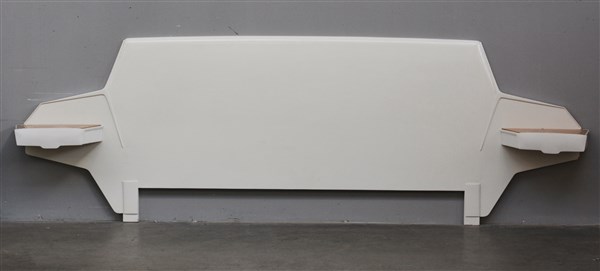 Testiera da letto matrimoniale in legno laccato bianco con cassettini pensili e vetro retroverniciati. Italia, anni '50. (cm 284x96) (lievi difetti e restauri)