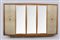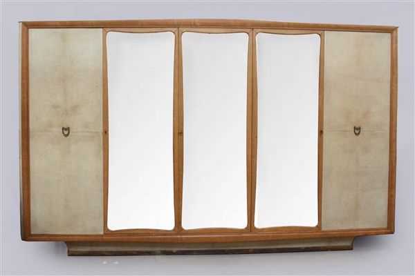 Armadio a cinque ante rivestito in pergamena con tre ante centrali a specchio, maniglie in ottone, basamento in ottone e pergamena. Interni in acero a otto cassetti di diversa larghezza. Cantù, anni '30/'40. Recante marchio "ESPOSIZIONE PERMANENTE MOBILI-CANTU'". (cm 297,5x178x66) (lievi difetti)