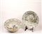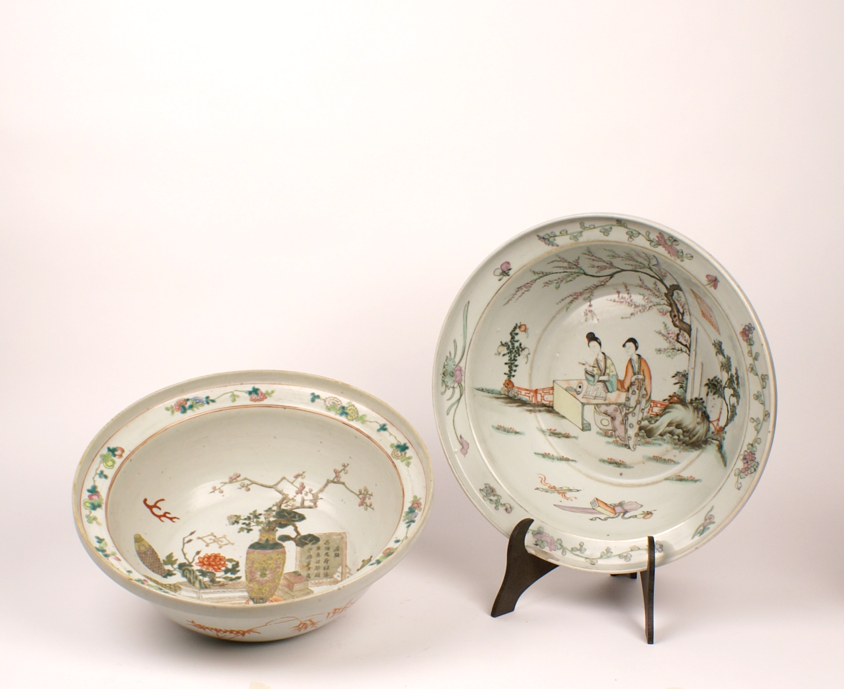 DUE CATINI IN CERAMICA SMALTATA Cina XIX Sec. dipinti in policromia su fondo bianco e decorati rispettivamente a motivi di figure femminili e di natura morta con vaso, poggianti su basi circolari in legno 13x36 cm.