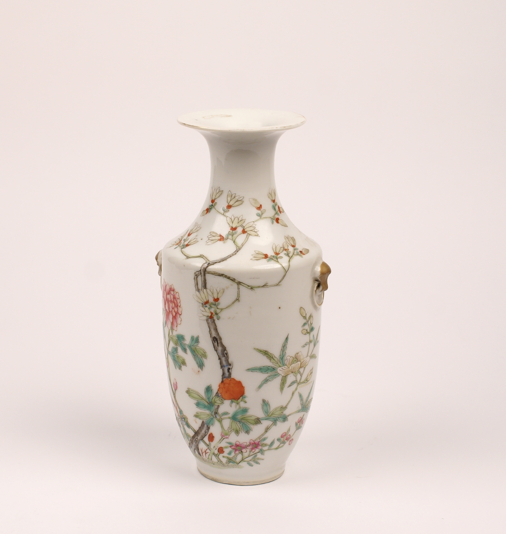 VASO IN PORCELLANA A BALAUSTRO Cina XIX Sec. dipinto in policromia e decorato a motivi floreali su fondo bianco h. 23 cm.