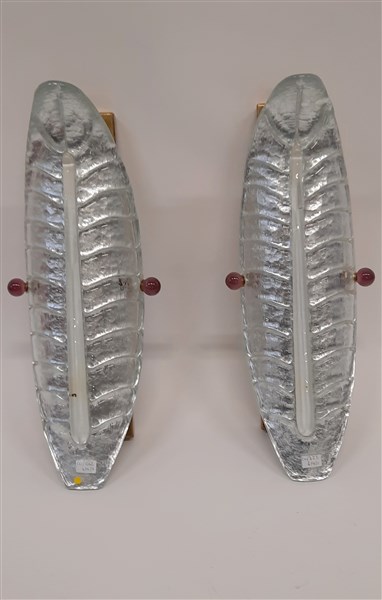 Coppia di lampade da parete con struttura in ottone e pomoli in vetro trasparente rosino, paralumi in vetro soffiato in stampo a forma di foglia con applicazione di foglia d'argento. Italia, produzione recente. (cm 13x43) (lievi difetti)