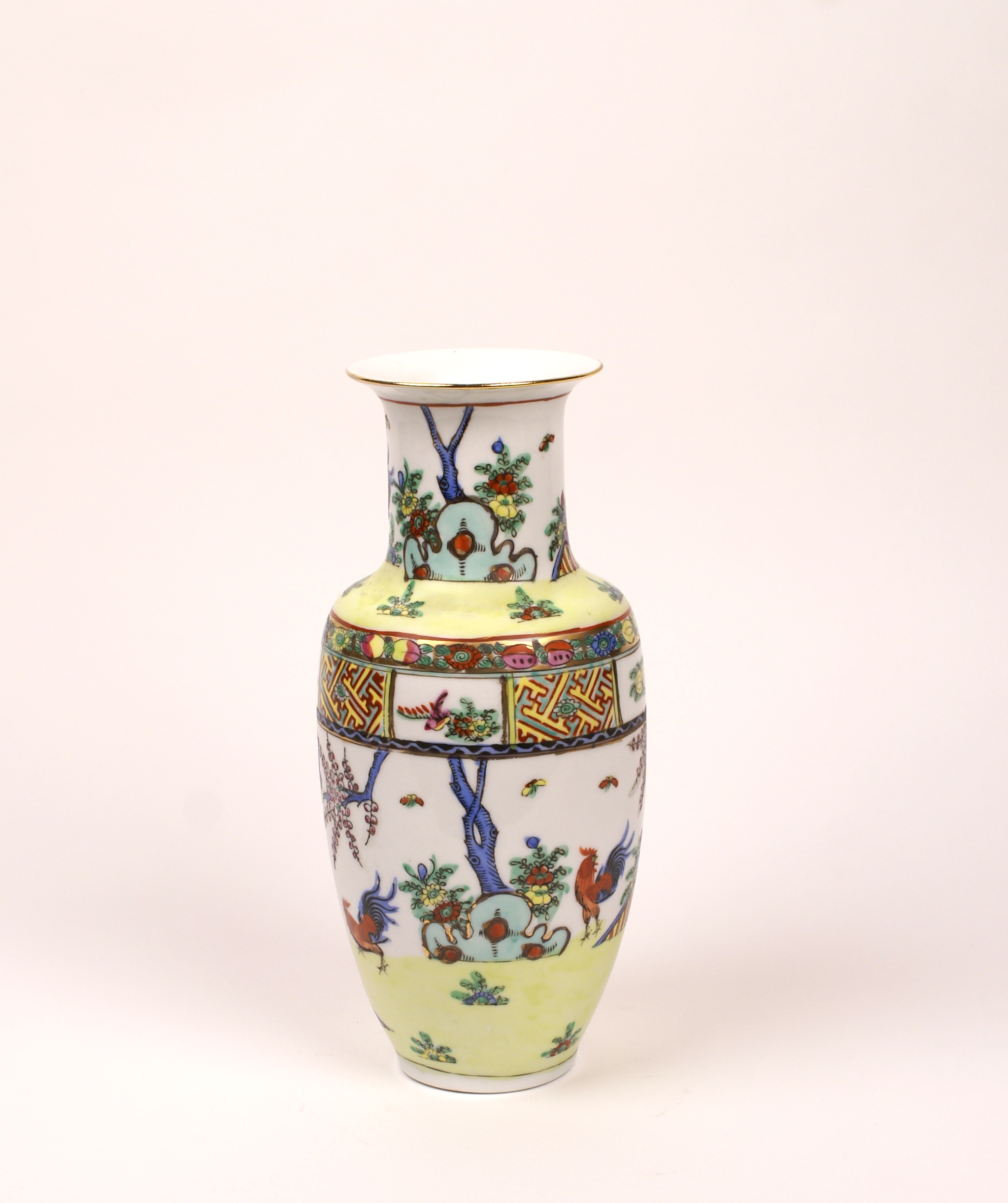 VASO A BALAUSTRO IN PORCELLANA Cina fine del XIX Sec. dipinto a policromia su fondo bianco e decorato a motivi floreali e di galli h. 26 cm.