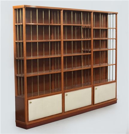 Libreria con ripiani a giorno in legno massello ed impiallacciato, parte inferiore a tre ante rivestite in pelle bianca, struttura in ottone. Italia, anni '60. (cm 239x181) (difetti)