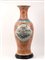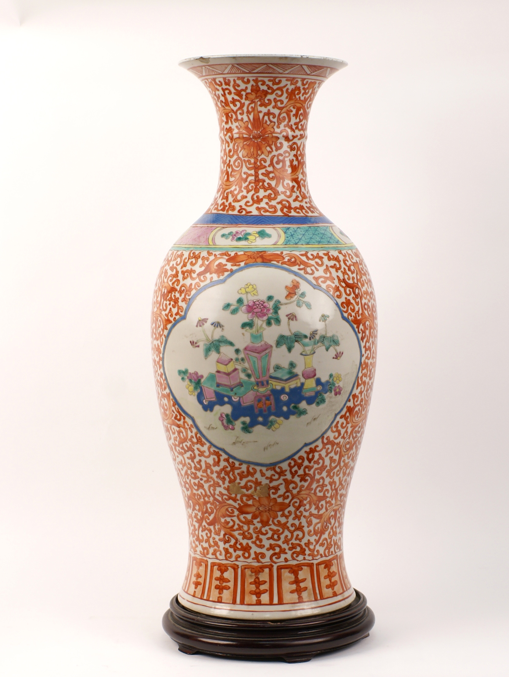 VASO A BALAUSTRO IN PORCELLANA Cina XIX Sec. con decorazioni policrome entro riserve su fondo arancio, poggiante su base circolare in legno h. 59 cm.