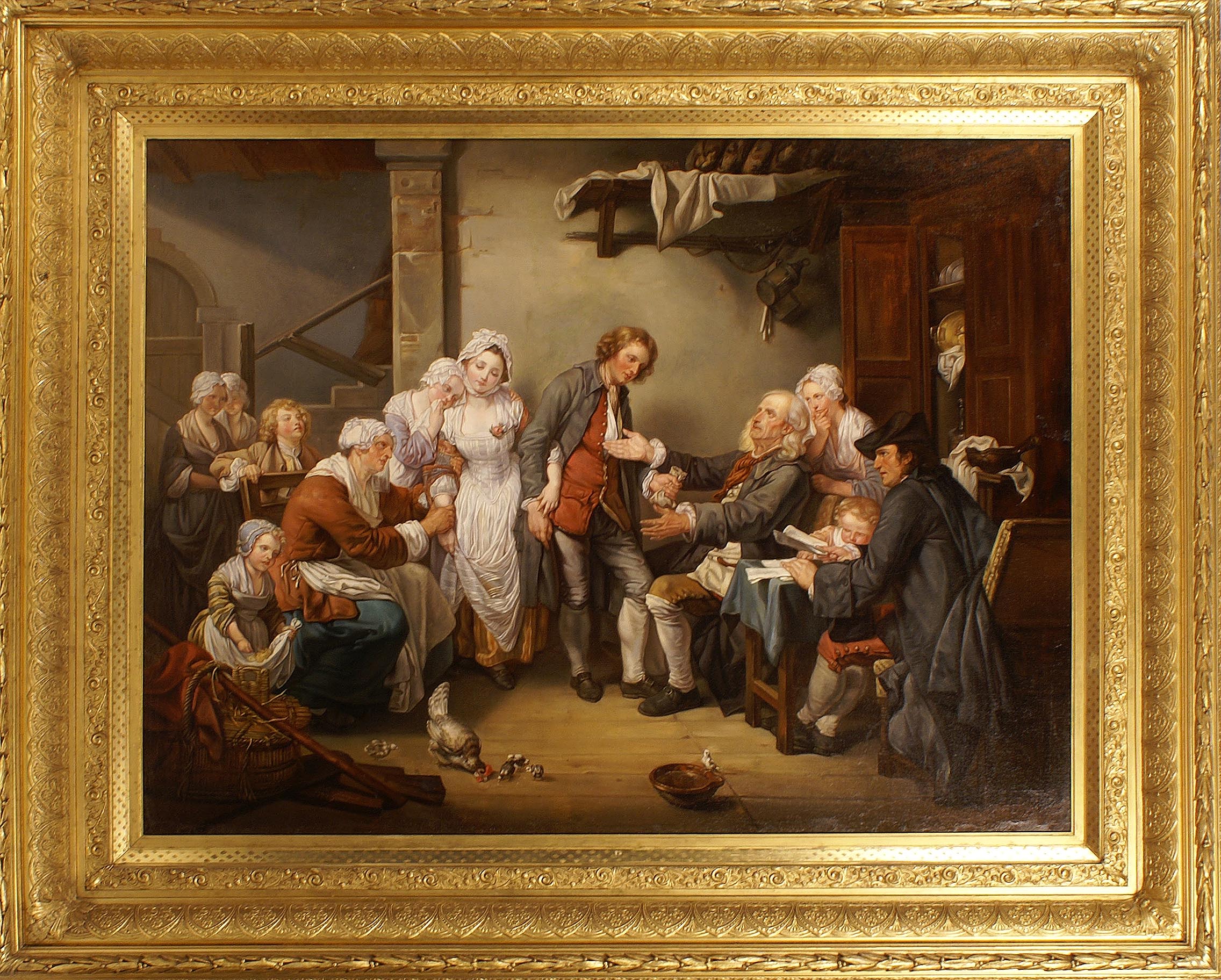 CAROLINE DELAGUETTE Francia 1820 -1860 La promessa di matrimonio, olio su tela, firmato in basso a sinistra, entro cornice in legno dorato Dim. 93x120 cm.