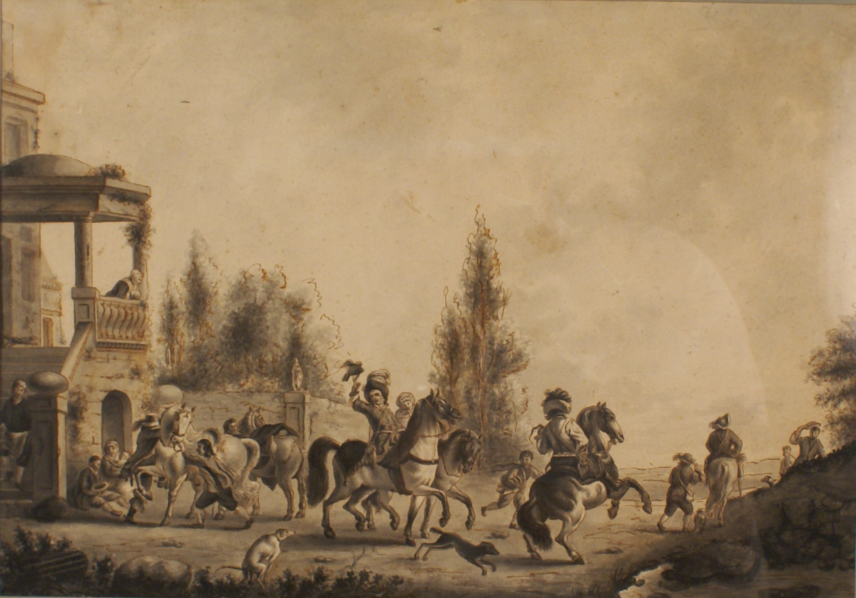 SCUOLA FIAMMINGA XIX Sec. Falconiere con cavalieri, disegno entro cornice 41x54 cm.