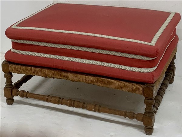 Panchetto con gambe e traverse tornite, seduta impagliata, cuscino rivestito in tesuto rosso (difetti)