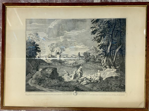 Incisione francese da un dipinto di Poussin (cm 74x104 il folio) in cornice (difetti)