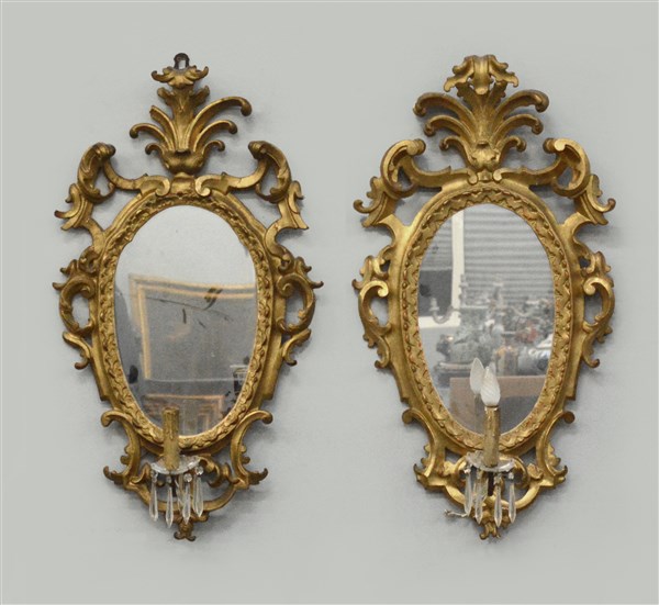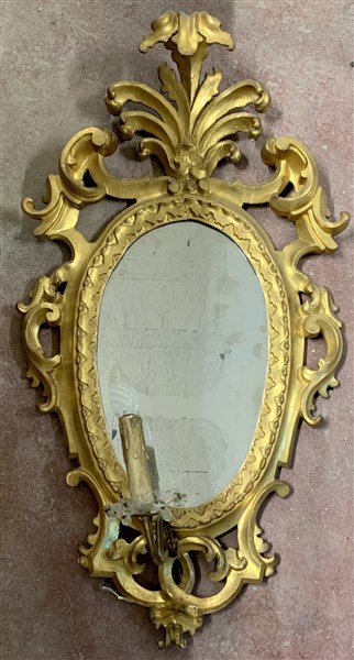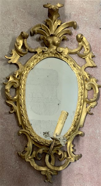 Due specchiere in legno dorato intagliato e traforato a volute fogliate e riccioli. Portacandela in metallo. Secolo XIX (h. max cm 88) (mancanze e restauri)