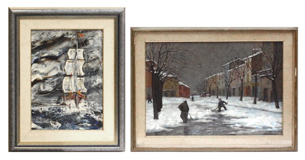 Lotto di due dipinti ad olio raffiguranti scorcio con neve e veliero in tempesta, autori e misure diverse, in cornici (difetti)