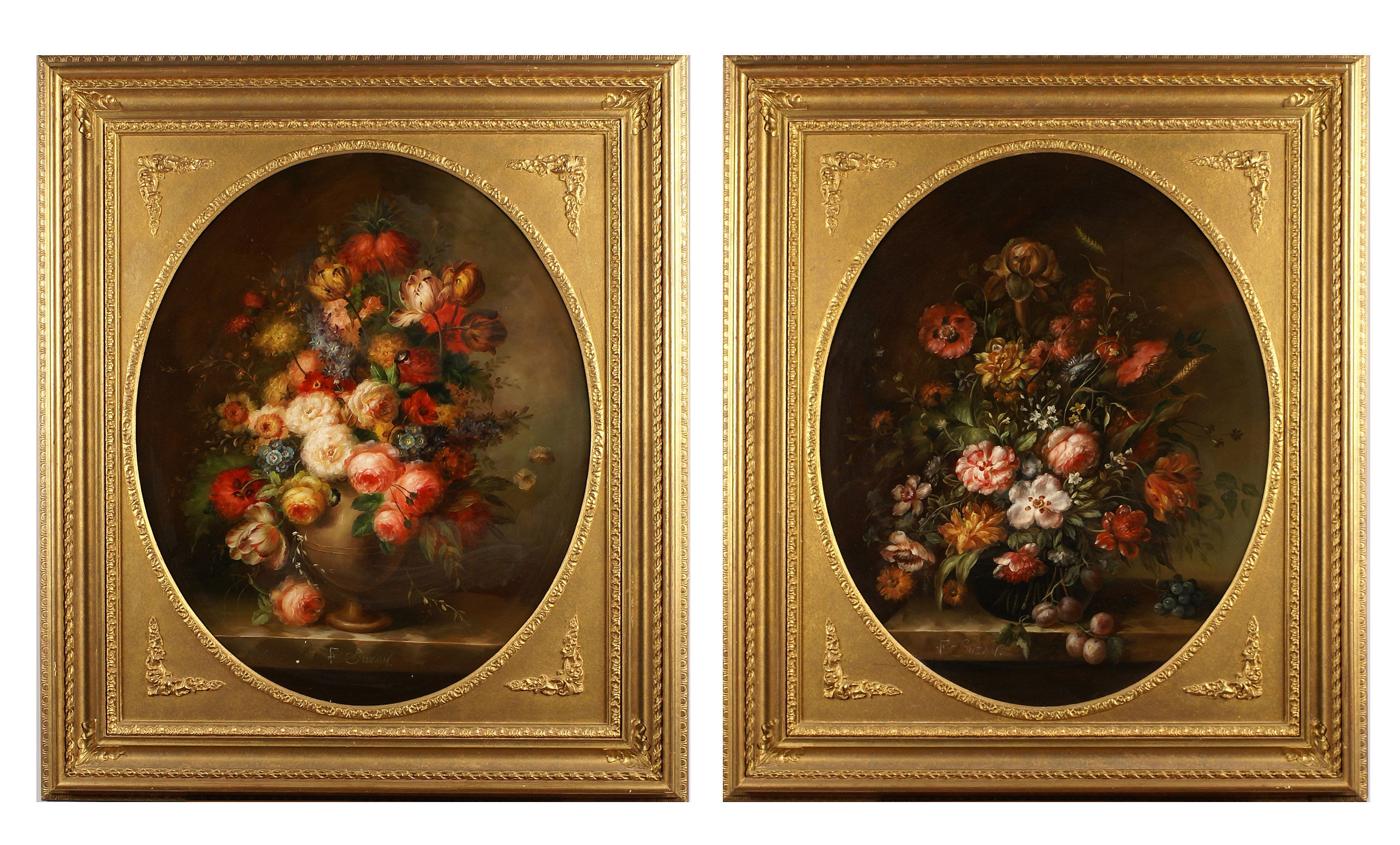 F. SUZAN XX secolo Natura morta di vaso con fiori, coppia di oli su tavola, firmati in basso, entro cornici 76x63 cm.