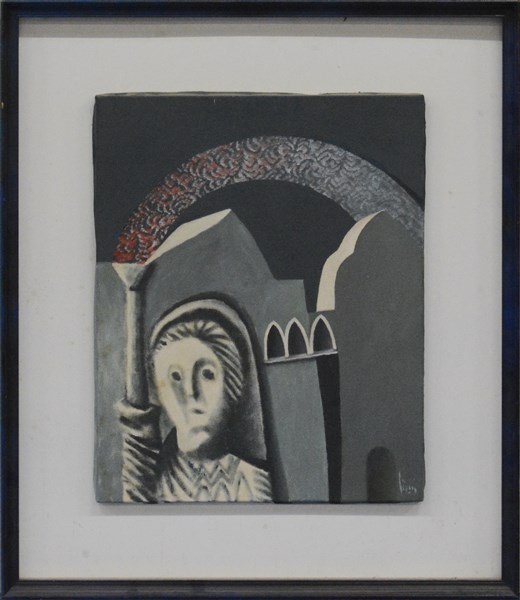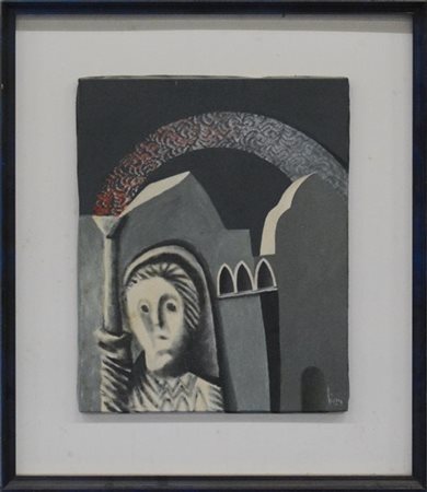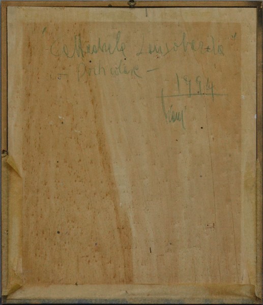Firma indecifrata "Cattedrale Lombarda - Particolare" 1994 olio su tela applicata su pannello di compensato (cm 49x40) firmato in basso a destra, firmato, titolato e datato al retro sul pannello di compensato, in cornice