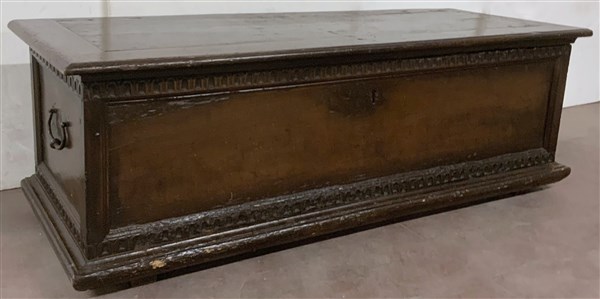 Antico cassone con specchiature incorniciate e maniglie laterali in ferro battu