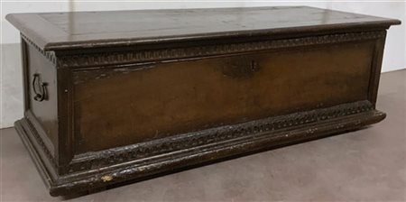 Antico cassone con specchiature incorniciate e maniglie laterali in ferro battuto (cm 161x53x59) (difetti e mancanze)