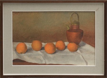 Firma indecifrata "Arance e versatoio" '71 olio su tela (cm 35x50) firmato e datato in alto a sinistra, in cornice