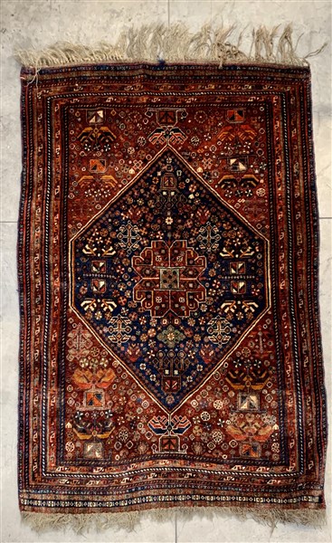 Tappeto Qashqai, Persia, inizio Secolo XX, decoro con medaglione romboidale a fondo blu su campo rosso scuro. Molteplici bordure (Lievi difetti) (cm 162x106)