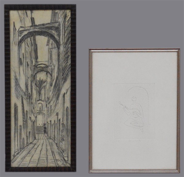 Lotto composto da una puntasecca firmata, numerata 5/18 e datata '77, raffigurante "Suonatore" e un disegno con vicolo di paese. Misure diverse, in cornici (difetti)