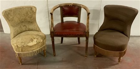 Lotto composto da una poltrona a pozzetto con gambe anteriori scanalate e una coppia di sedie da balia (difetti)