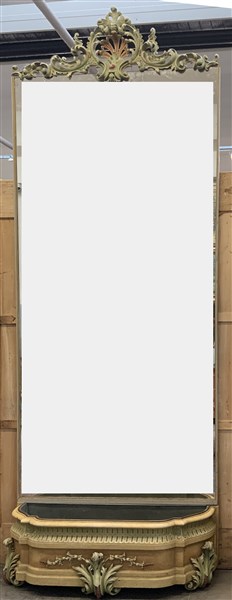 Specchiera fondosala con fioriera di forma sagomata in legno laccato a fondo avorio ed in policromia, scolpito a volute vegetali, conchiglia stilizzata e fiori (cm 136x390x40) (difetti e mancanze)
