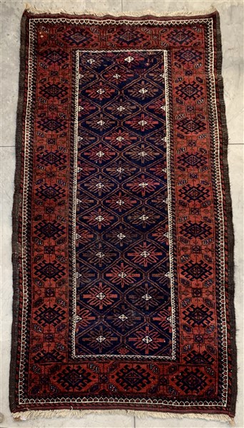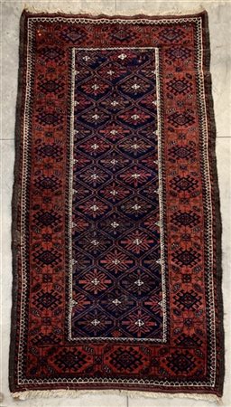 Tappeto Beluchistan, Persia, fine Secolo XIX, decoro a griglia con fiori stilizzati su campo blu. Bordura a granchi su fondo rosa (Lievi difetti) (cm 180x93)