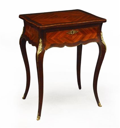 Tavolino da lavoro di forma mossa lastronato e filettato, guarnizioni in bronzo dorato. (difetti)