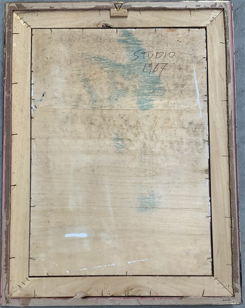 Firma indecifrata "Studio" '67 olio su compensato (cm 70x50) firmato e datato in basso a destra, titolato e datato al retro, in cornice