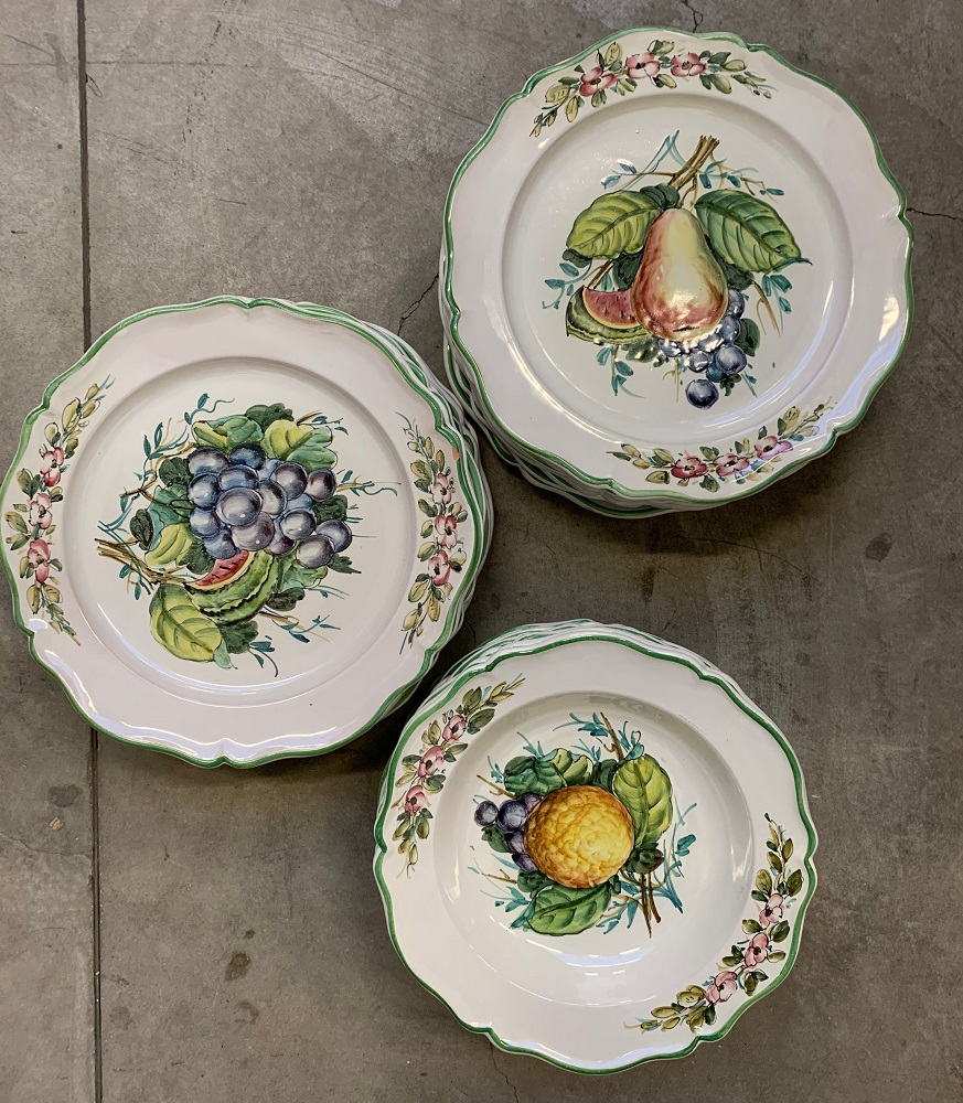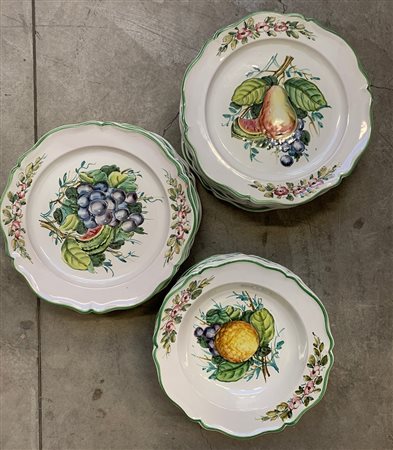 Manifattura del secolo XX, lotto composto da trentasei piatti piani, sedici piatti fondi e sedici piatti piccoli in ceramica decorata in policromia a frutta (difetti)