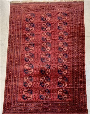 Tappeto Afghan-Beshir, Turkestan occidentale, decoro a zampa d’elefante con Gül divisi a quadranti su fondo rosso. (Difetti) (cm 480x314)