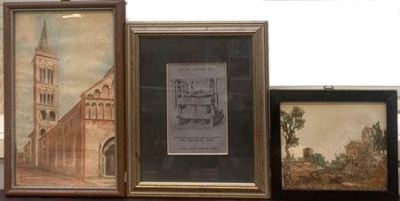 Lotto composto da un disegno raffigurante basilica, un collage raffigurante pae