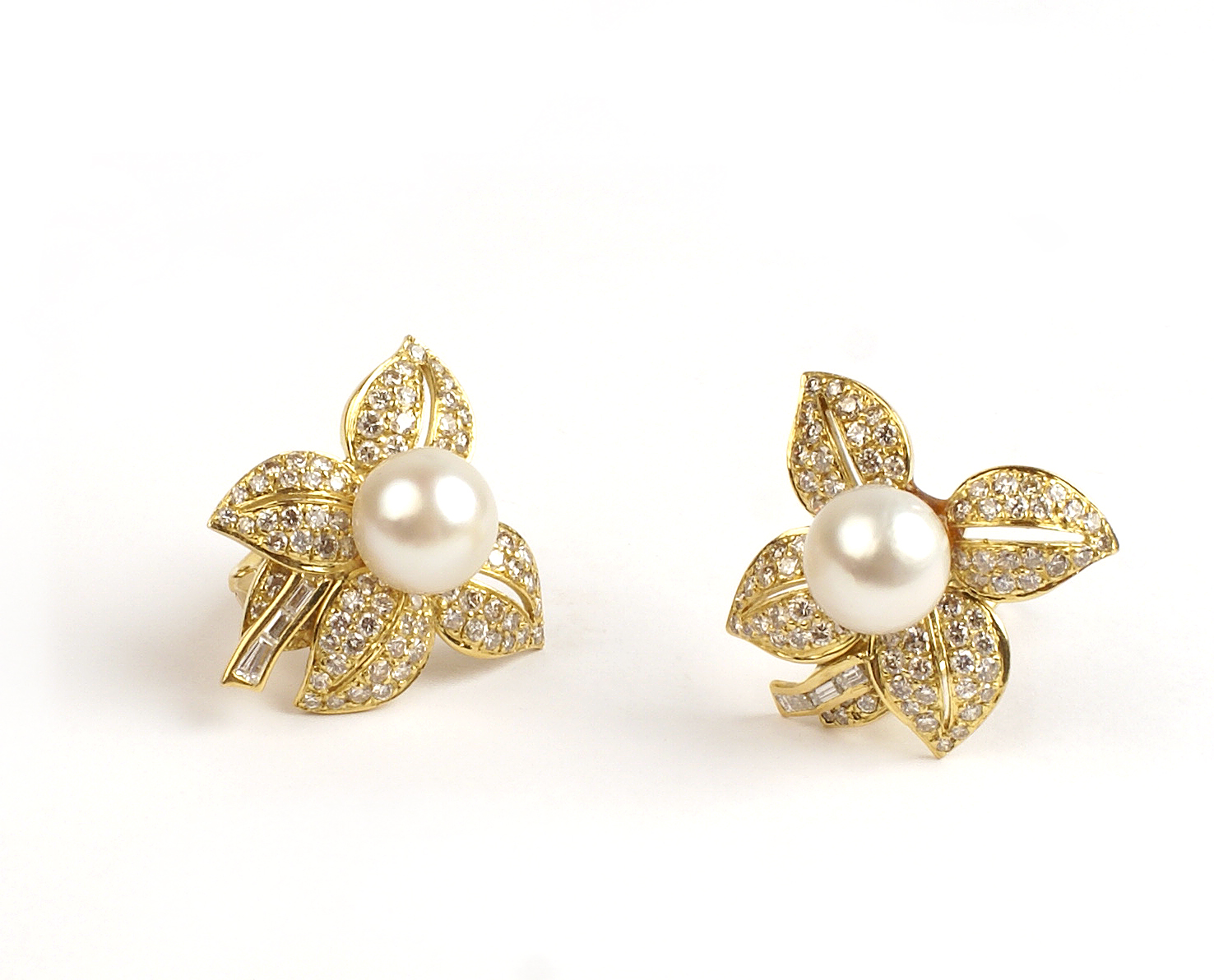 ORECCHINI A LOBO IN ORO GIALLO 14KT a motivo floreale con diamanti taglio brillante e baguette per ct. 3,5 circa e due perle coltivate di millimetri 12 circa 26,9 gr.