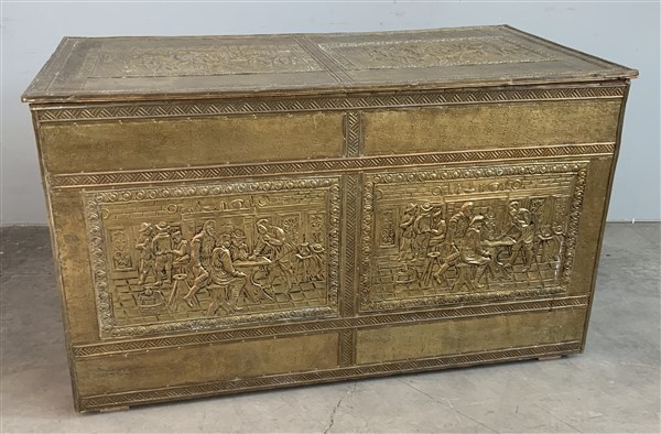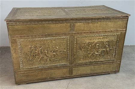 Cassone in legno interamente rivestito in ottone decorato da placche sbalzate con scene di vita popolare (cm 109x64x58) (difetti)