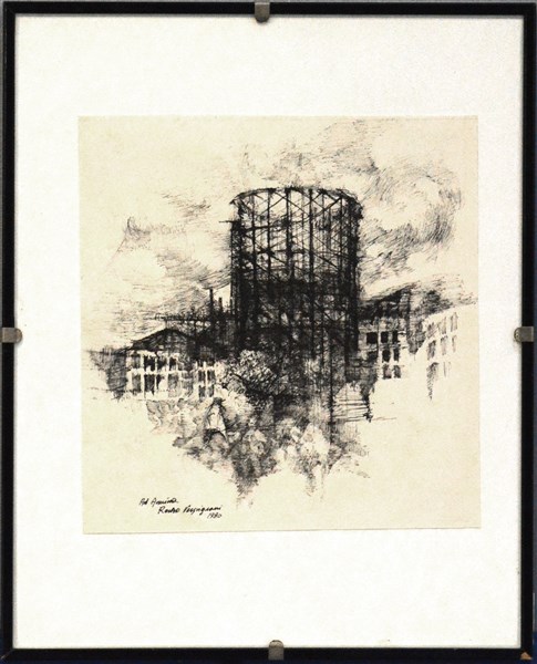Renzo Vespignani "Gasdotto" 1980 china su carta cm 16,5x15,5 dedicato, firmato e