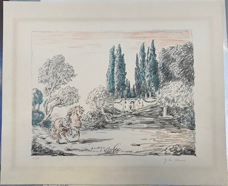 Giorgio de Chirico "Cavallo a Villa Falconieri" 1954 litografia a colori cm 49x5