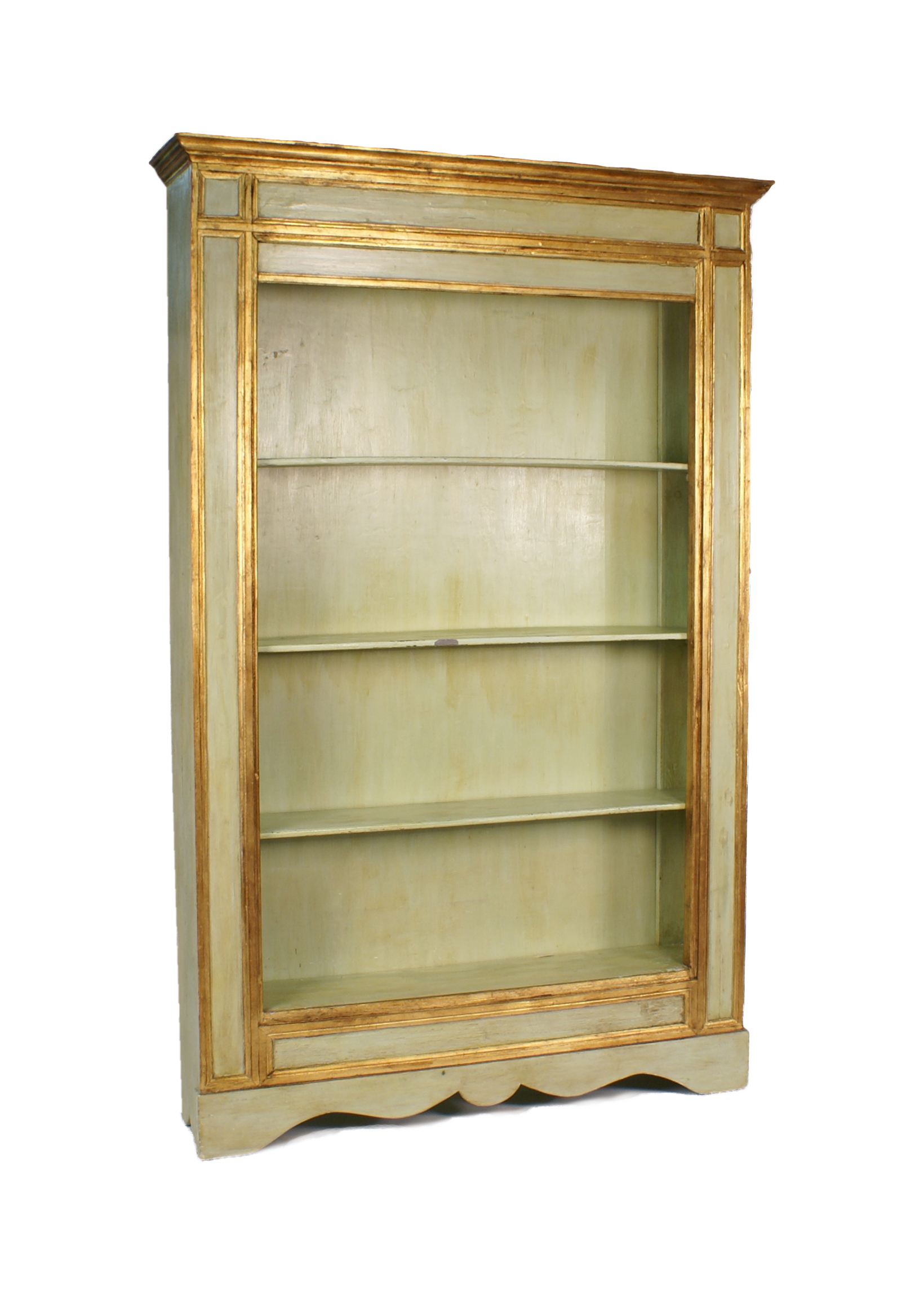 LIBRERIA A GIORNO CON TRE RIPIANI vecchia manifattura struttura architettonica in legno laccato nella tonalità del verde e parzialmente dorato 226x150x33 cm.